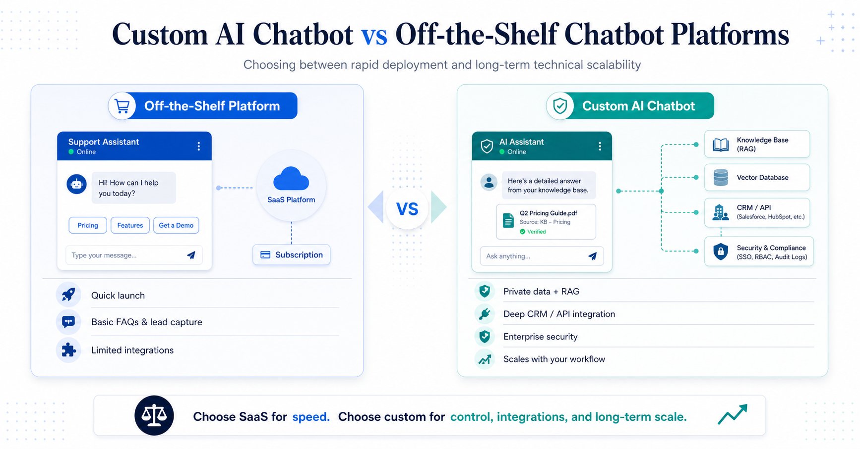 The choice depends on your immediate goals and technical requirements. If you need a functional bot for lead generation or basic customer support within hours, a SaaS platform is the right choice. When comparing a custom chatbot vs SaaS chatbot for high-security environments, custom engineering is the better path for bots that must access private data or integrate deeply with a CRM.